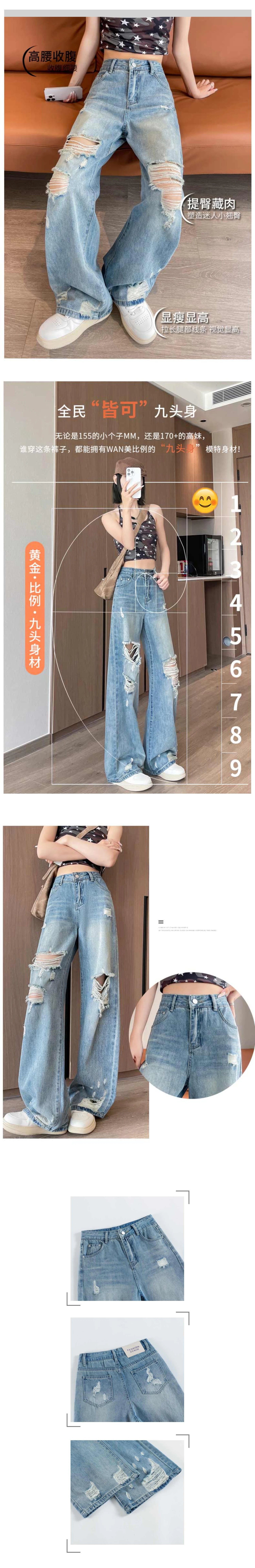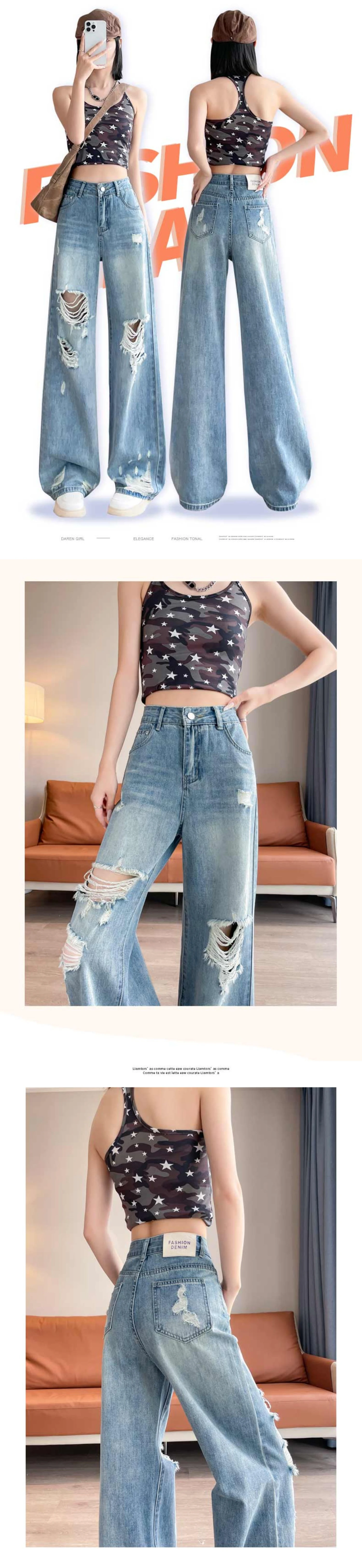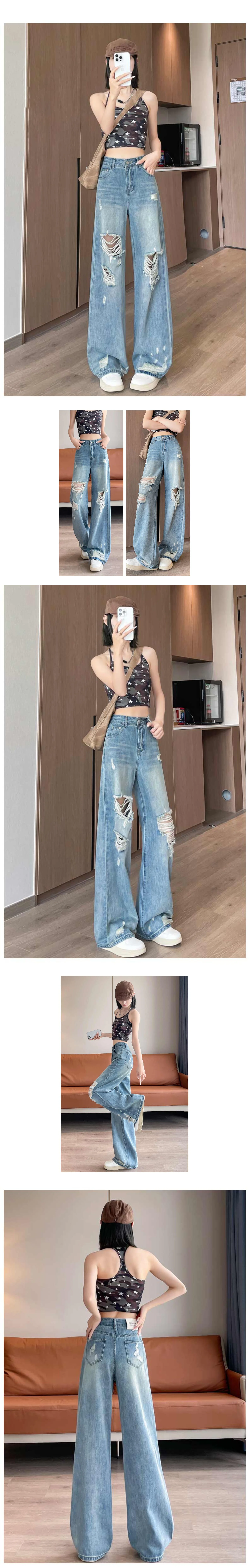 Jeans à trou déchiré pour femmes de style américain, taille haute, décontracté, ample, pantalon en jean à jambes larges, pantalon droit, vêtements de rue pour femmes